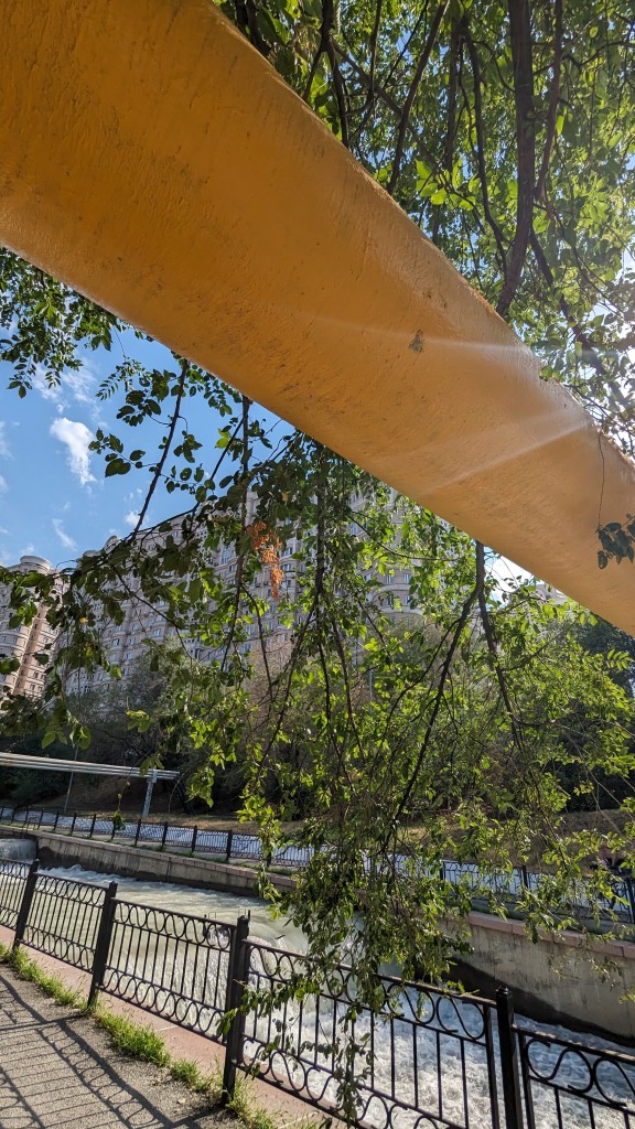 Usually these pipes were about six to eight inches in diameter, and some times they were joined by identical but smaller pipes running parallel on their own supports. Sometimes the pipes sent small shoots down the side streets, and sometimes they were joined in a conglomeration of elbows and valves. As one visiting friend later put it, they were rather “Seussical.” Their color ranged from the happy new yellow of a school bus, to the tired pale yellow of a paint job which had borne too many years of the intense Kazakh sun, to the long-since-gone yellow-now-rust of a long-used piece of machinery.